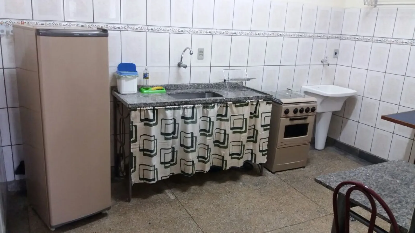 Armário, geladeira, bancada da pia, fogareiro e botijão de gás.